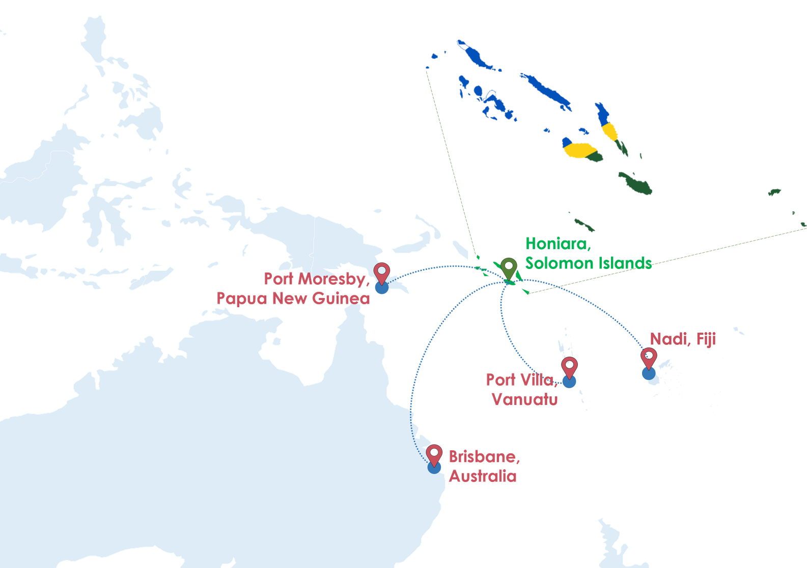 As the national carrier, Solomon Airlines operates several direct international routes connecting the Solomon Islands with key regional hubs such as Nadi (Fiji), Brisbane (Australia), and Port Vila (Vanuatu). These services provide critical connectivity for business and tourism, helping to link Solomon Islands to regional and global markets.
