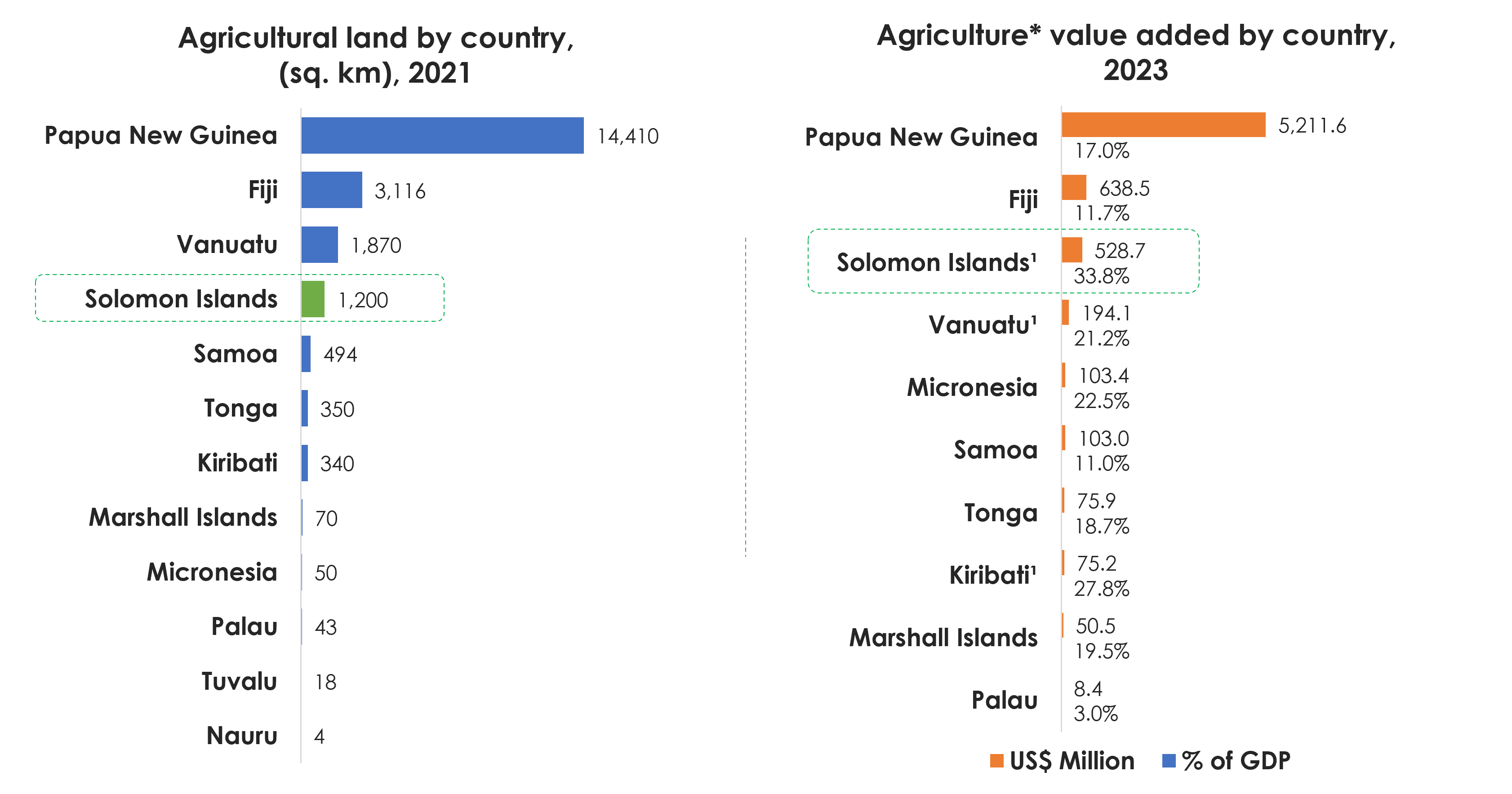 - Land availability and relevance: Solomon Islands has 1,200 km² of agricultural land, ranking it the 4th largest among Pacific Island nations.