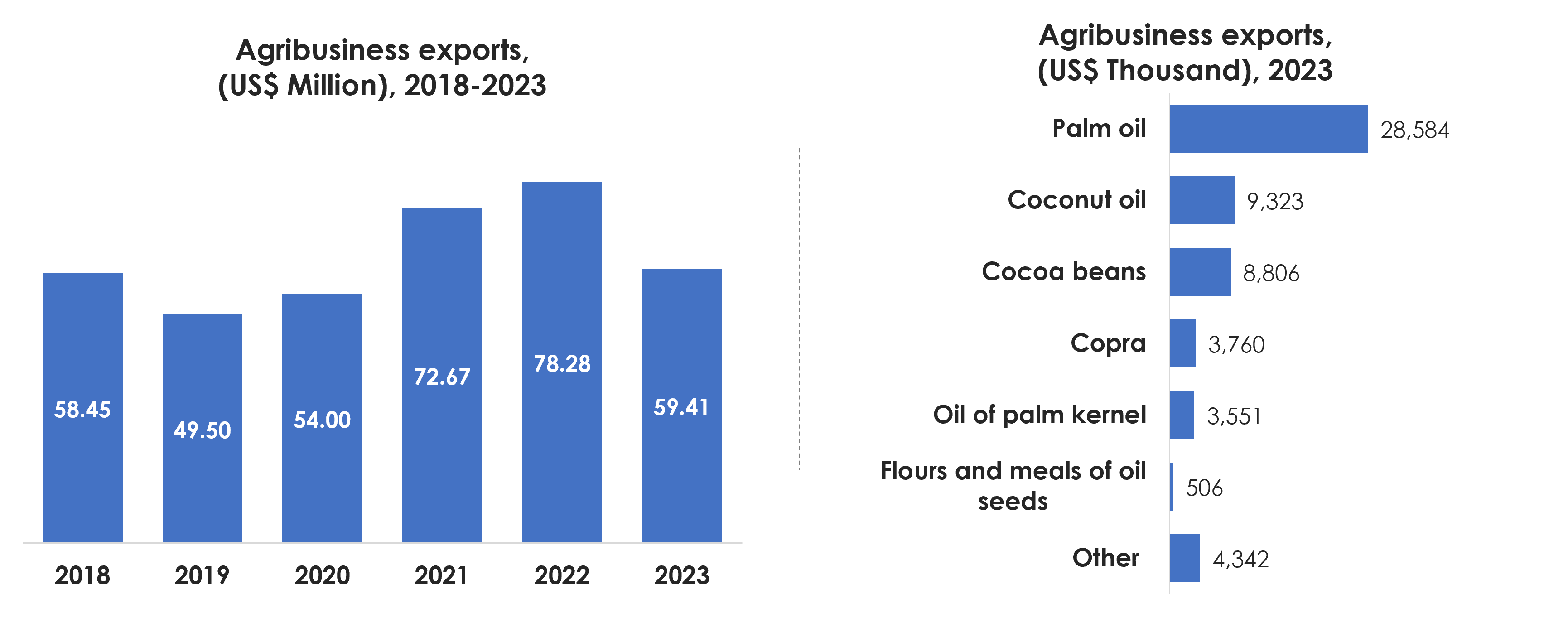 - Export-oriented crops: Crude palm oil, coconut (copra and virgin coconut oil), cocoa beans, and timber products — with opportunities across farming, processing, and export packaging.