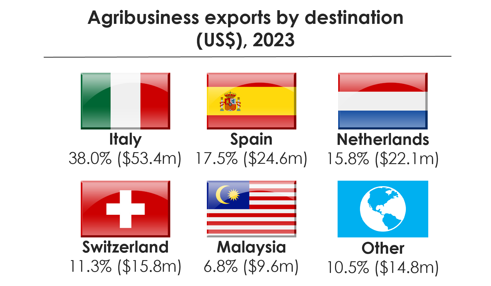 - Export destinations: Italy leads as the top export market, receiving 38% of Solomon's agribusiness exports (US$53.4 million), followed by Spain (17.5%, US$24.6m) and Netherlands (15.8%, US$22.1m). Together, these three countries account for over 70% of the flows.