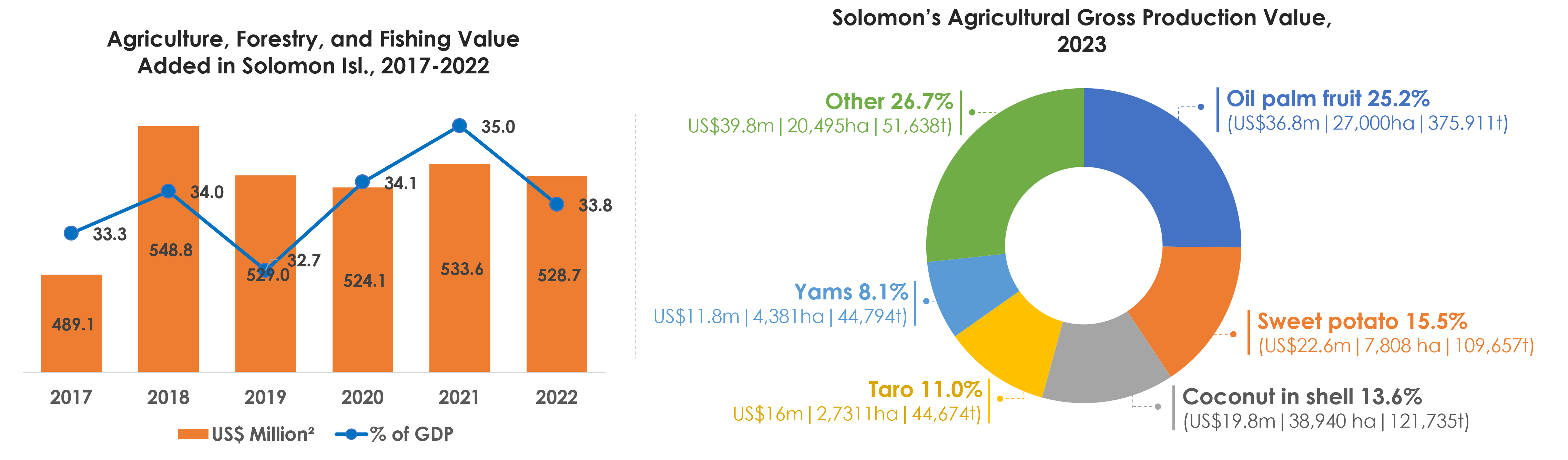 - Resilient growth engine: Agriculture, forestry, and fishing have consistently contributed around one-third of Solomon Islands’ GDP, generating US$528.7 million in 2022 and achieving an average annual growth rate of 1.6% over the past five years.
