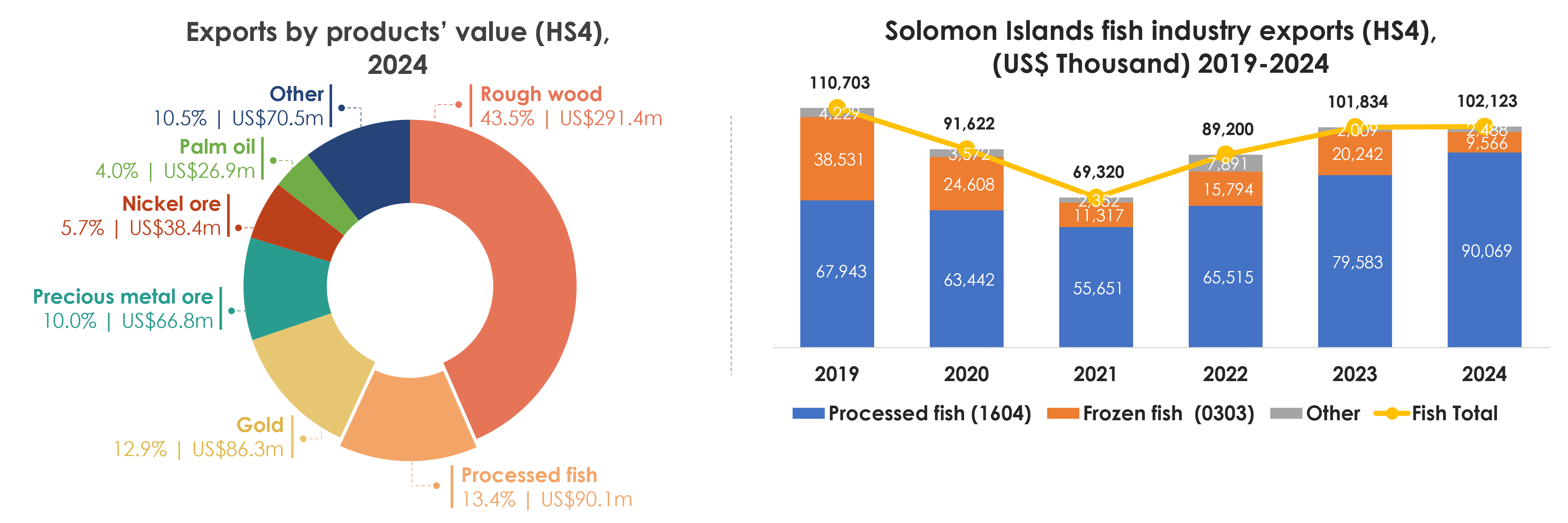 - Fish is a top export sector: Fisheries products represented 13.7% of total exports in 2024, making them one of the Solomon Islands’ top five export categories alongside wood, gold, and metal ores.