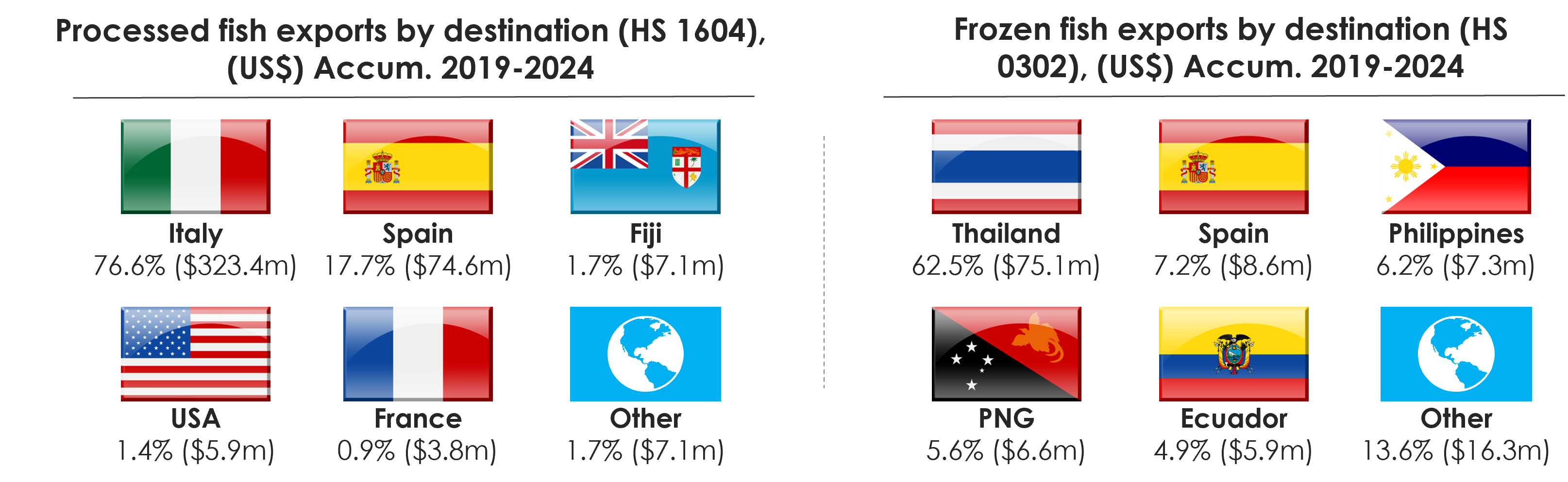 Export destinations for processed fish: Between 2019–2024, processed fish exports were highly concentrated in Europe, with Italy alone absorbing 76.6% (US$323.4 million), followed by Spain with 17.7% (US$74.6 million). Smaller markets included Fiji, the USA, France, and others, together making up less than 6% of exports.