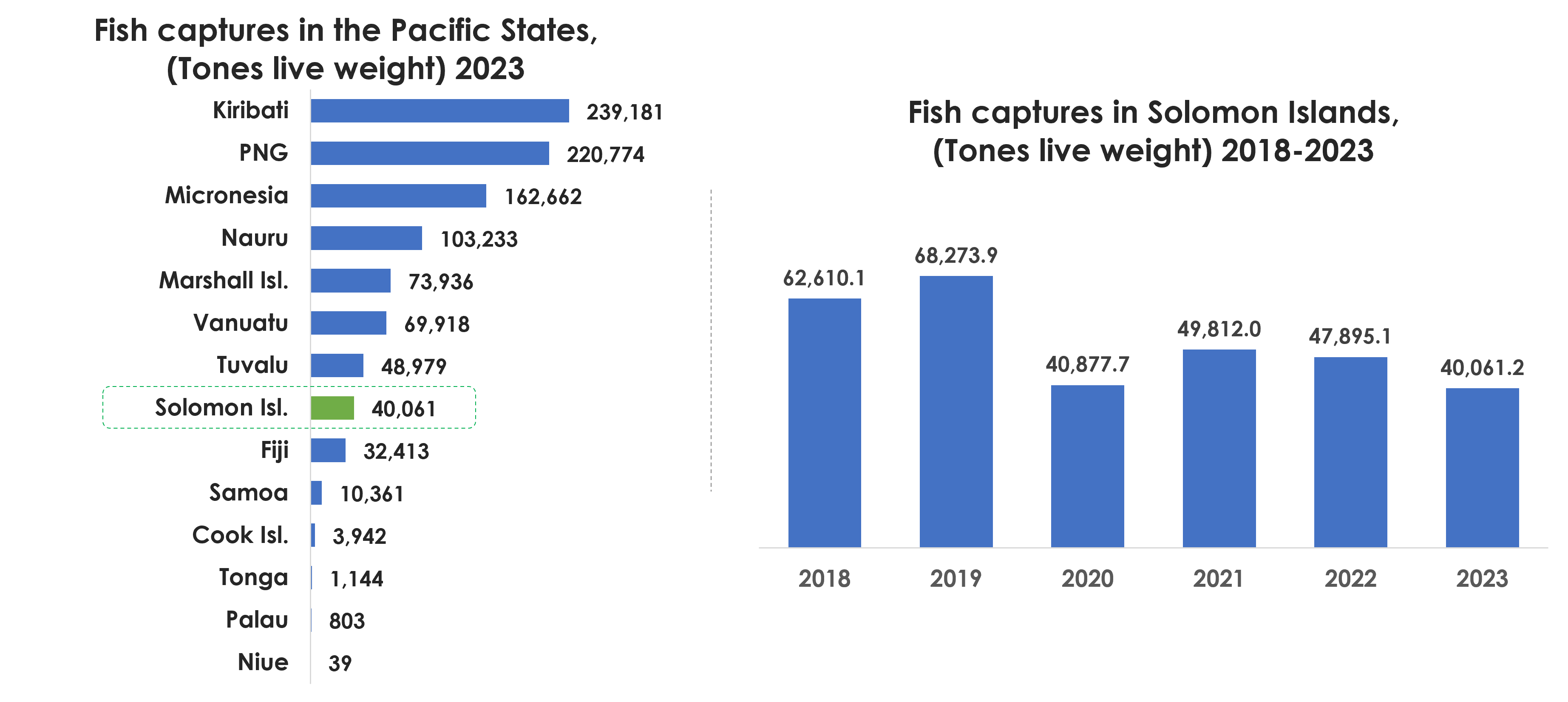 - Strong regional standing with untapped potential: The Solomon Islands captured 40,061 tons of fish in 2023, ranking 8th among the 14 pacific island states. Despite having the 3rd largest Exclusive Economic Zone (EEZ) in the Pacific, current production remains relatively low compared to regional leaders, underlining the vast potential for growth and modernization.
