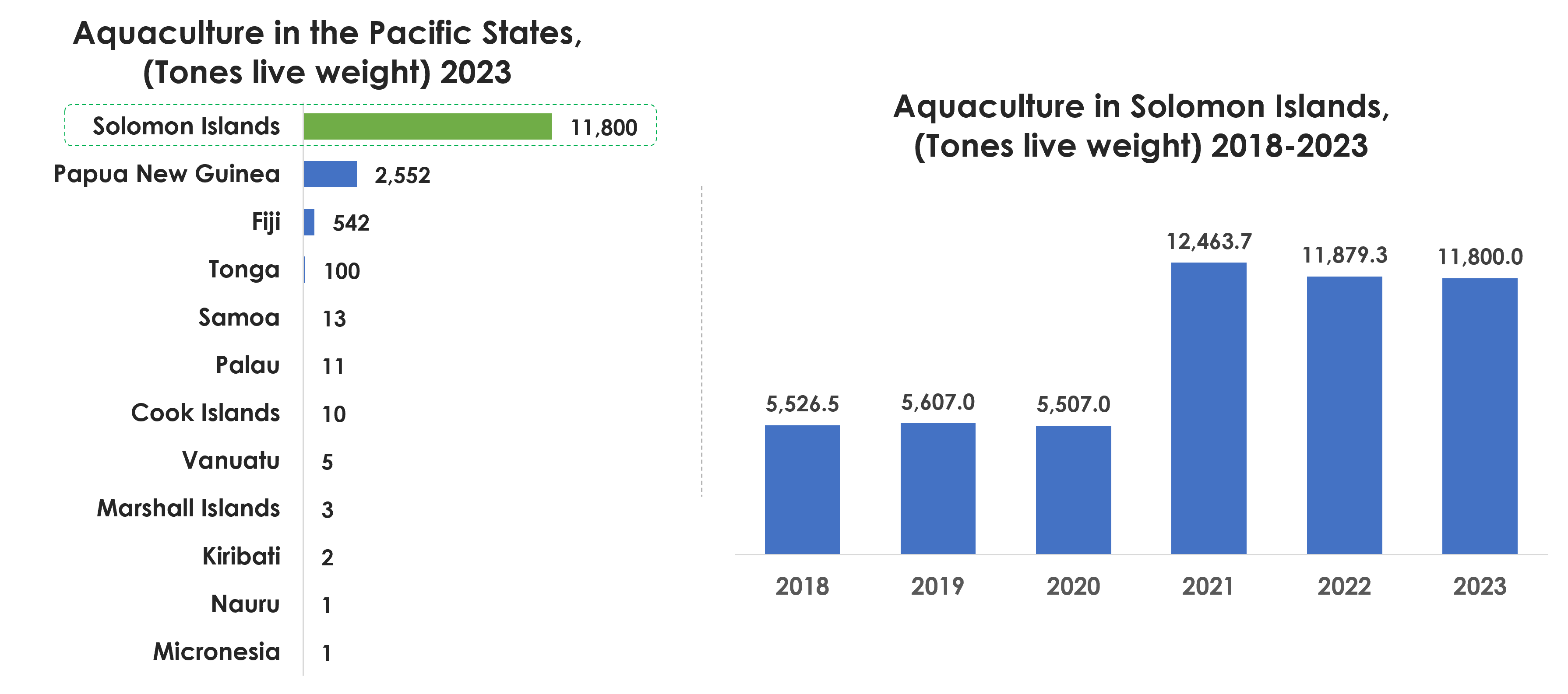 - Pacific leader in aquaculture: The Solomon Islands produced 11,800 tons in 2023, accounting for 78% of all aquaculture output in the Pacific. This makes the country the clear regional leader, far ahead of Papua New Guinea (2,552 tons) and Fiji (542 tons).